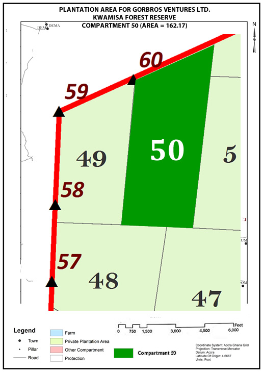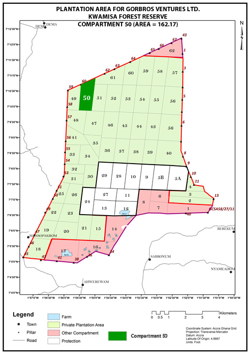Our farm is located in compartment 50 in the Kwamisa forest reserve in the Ashanti region of Ghana. It occupies a total area of 162.17 hectares.